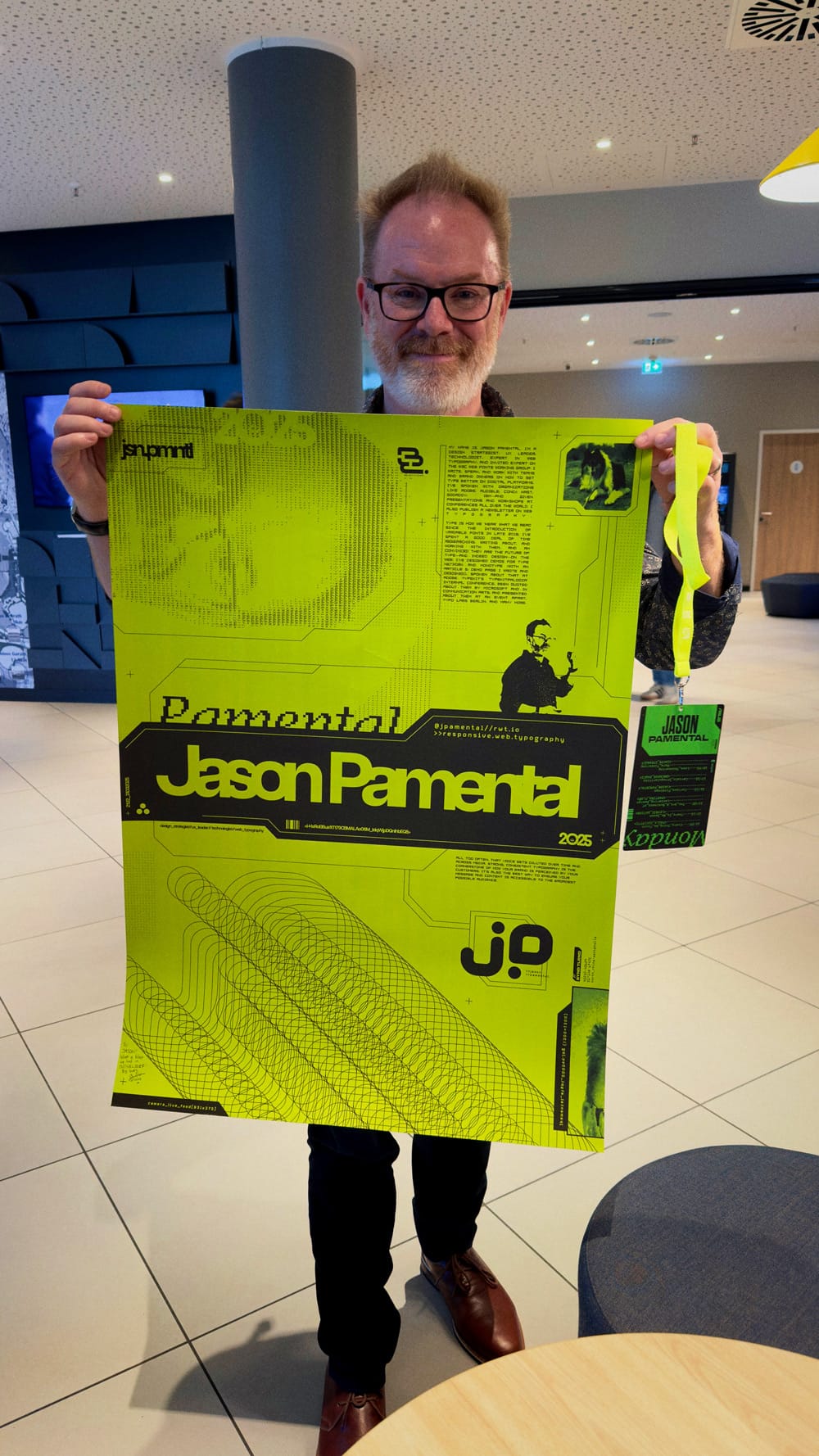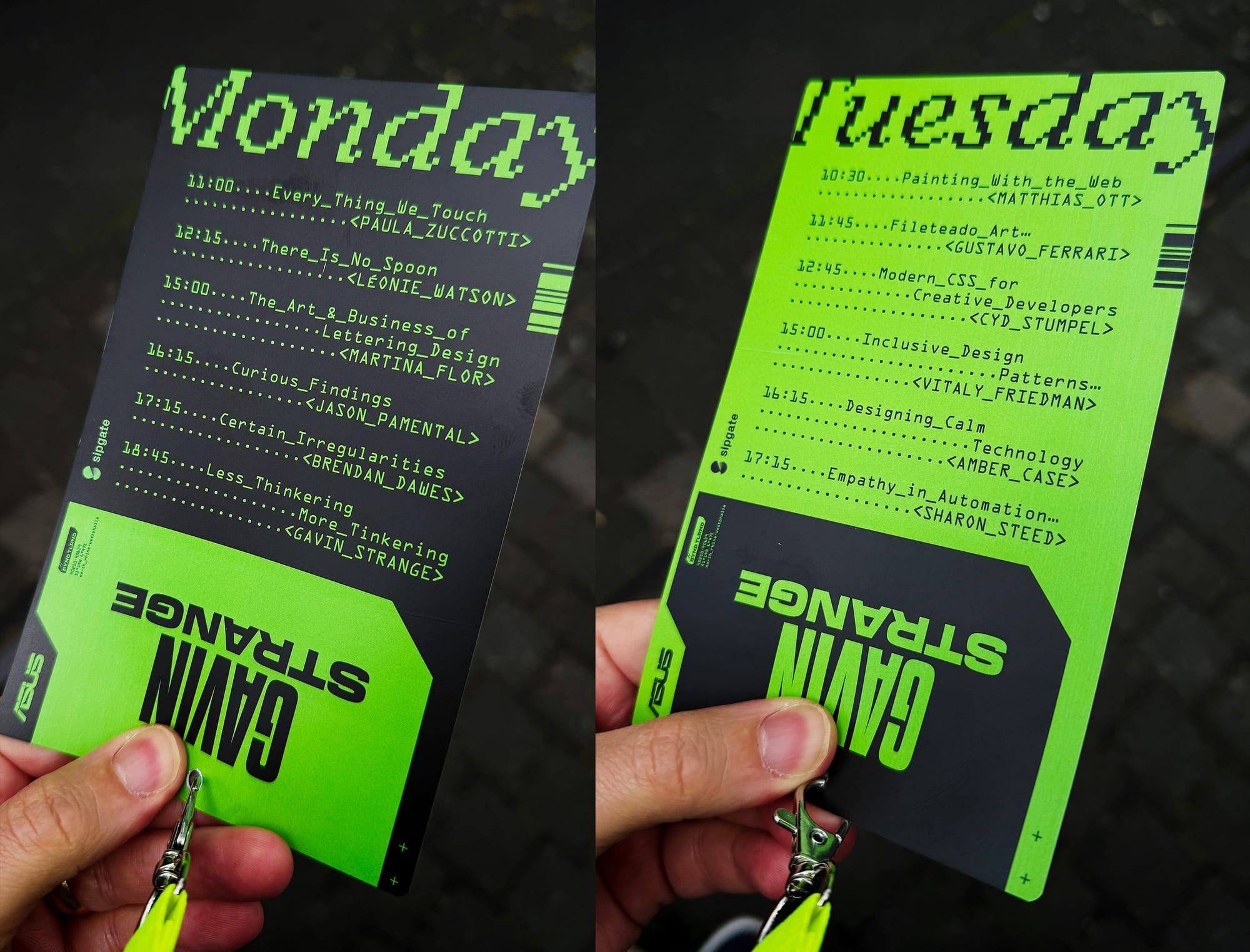That wasn't the end for me at the festival though, not only did I get to give a talk at the end of the first day, I could do design all the elements for the rest of the festival too, rolling out this OTT design aesthetic to everything the attendees touched! From the attendee badges / schedule lanyards...