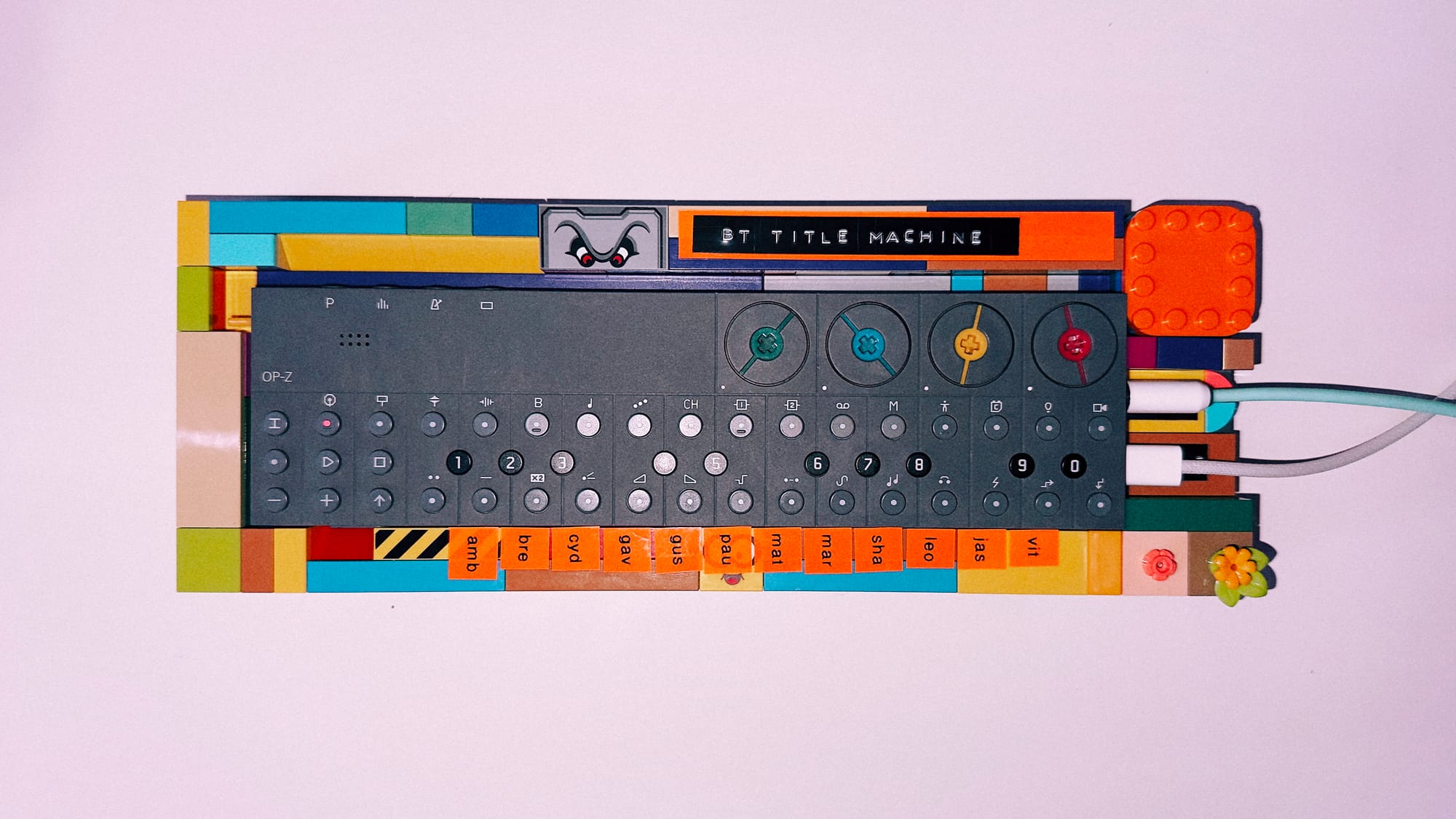 First things first though, it needs to look the part, so I raided my son's Lego boxes to get started. See, I am crap at making anything by hand. Wood? Useless. Metal? Hopeless. Lego? Now you're talking. A few years ago, inspired by my friend Rob, I made 'Pinplo'; a Duplo-framed Switch-powered virtual pinball machine. I've been a longtime fan of the mighty Brosmind and how they create their own custom controllers for their talks. Inspired by that DIY approach I wanted to give the OP-Z it's own Lego housing - not only to let me attach labels so I could keep track of which button triggers which speaker, but also so I could secure something else to the rig...