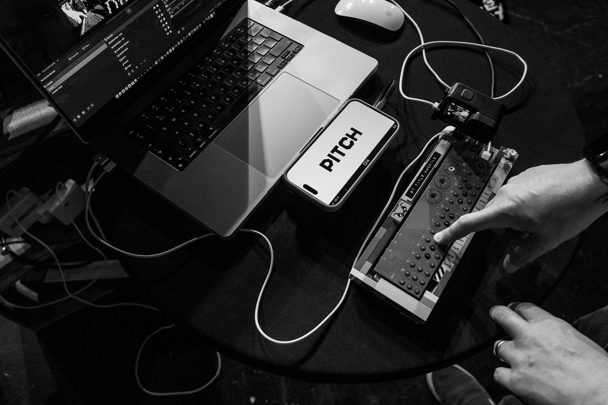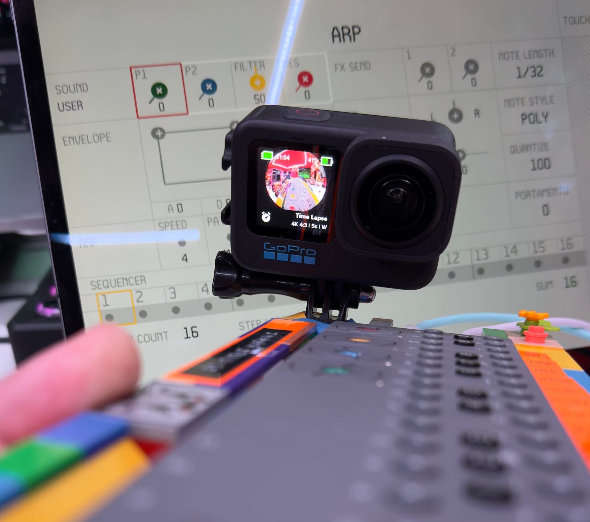 A GoPro! If I was playing the titles live then I really want the audience to know it's happening right there, right then. In my own talks I've started incorporating a GoPro into my silly musical intermissions, and it always helps show it's 'real'. I wanted to make sure with these titles people could see it was really happening in front of them, so using a bit of Sugru, I secured a GoPro mount onto the top-right of the OP-Z-Lego 'rig'.