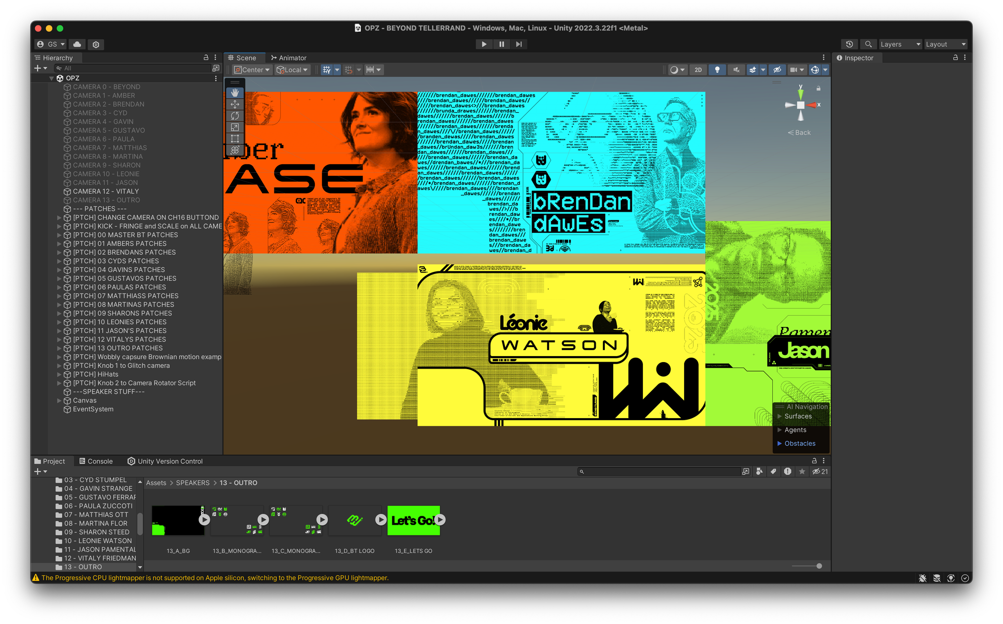 With the tech all set-up and working, it was then on with actually populating it with real content! Up until then, I was working with test graphics and early prototypes. Once I was confident everything worked, it was then time to take all 13 designs (12 speakers and 1 main conference graphic) and connect them up so the OP-Z could control them. It was a matter of taking each design, splitting it up into different layers, and exporting them out as transparent PNGs which I would then import into Unity. I wanted to make the elements that were gonna move as obvious as possible, so tie certain graphics to the kick, snare and hi-hat - sounds that were going to stand out.