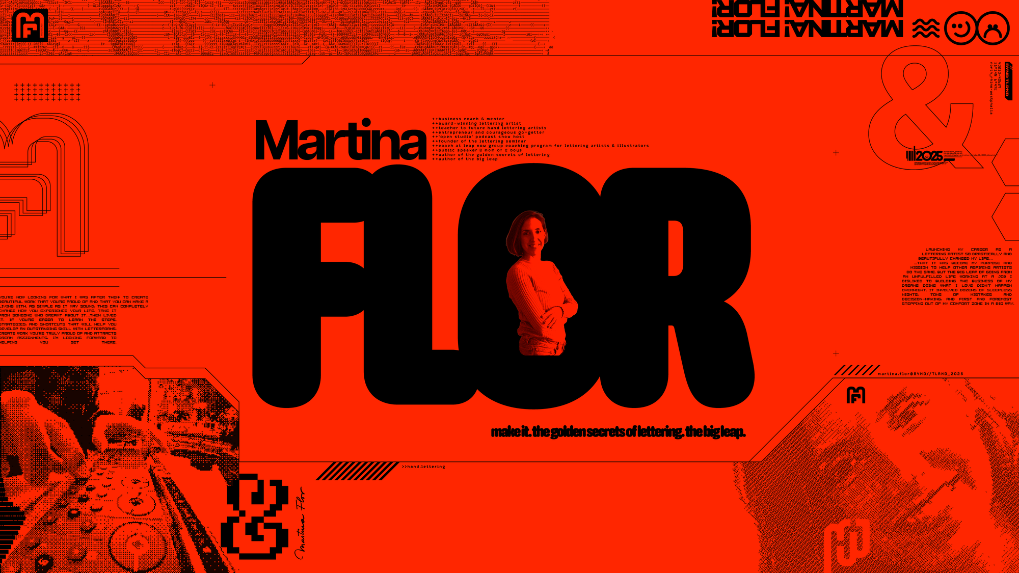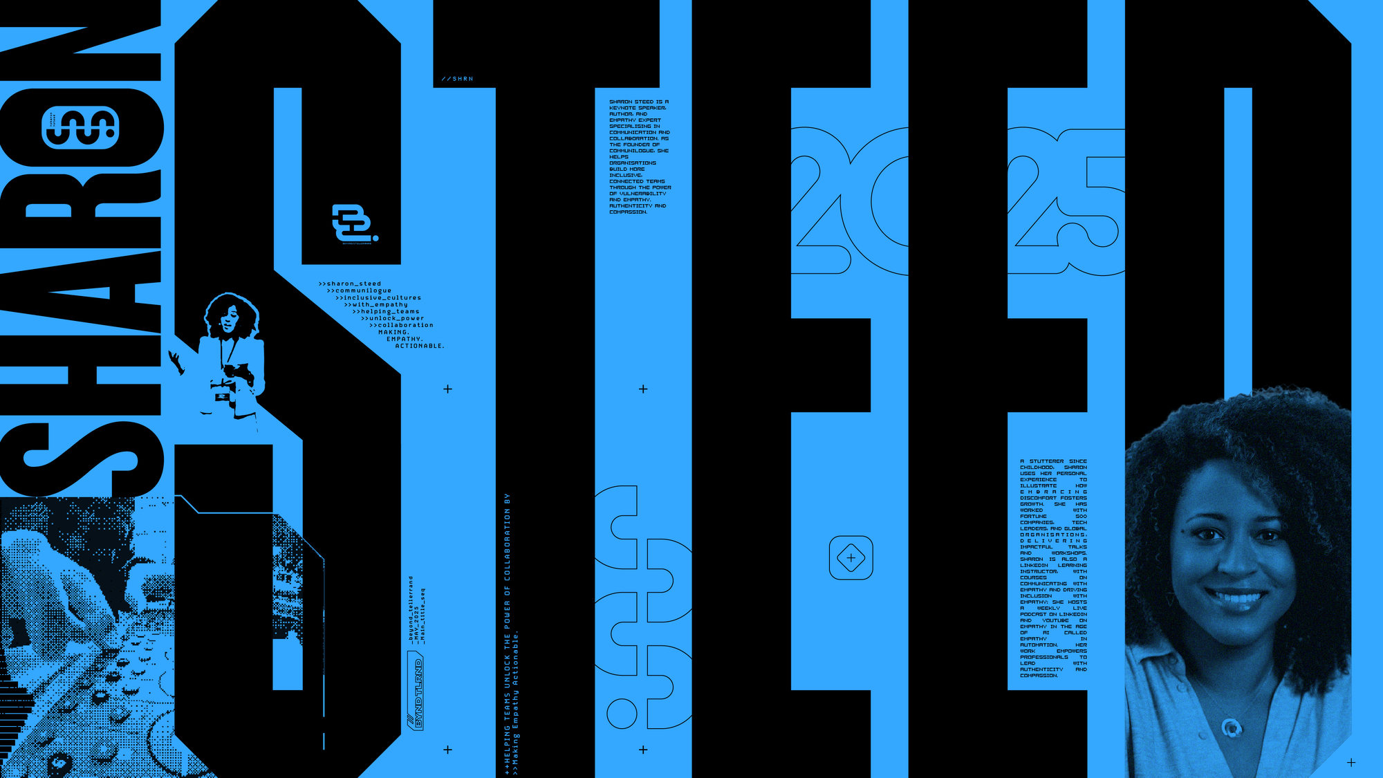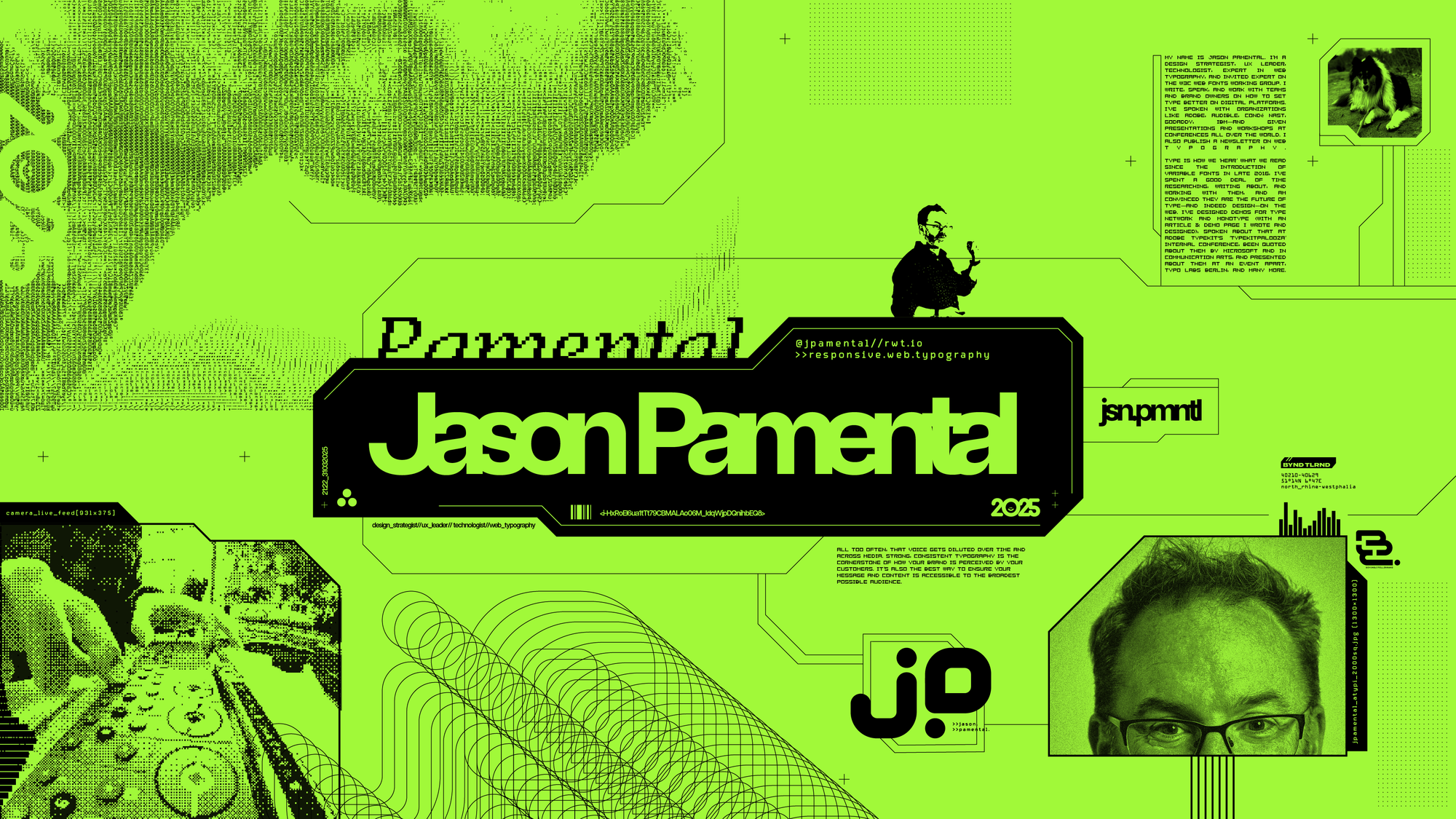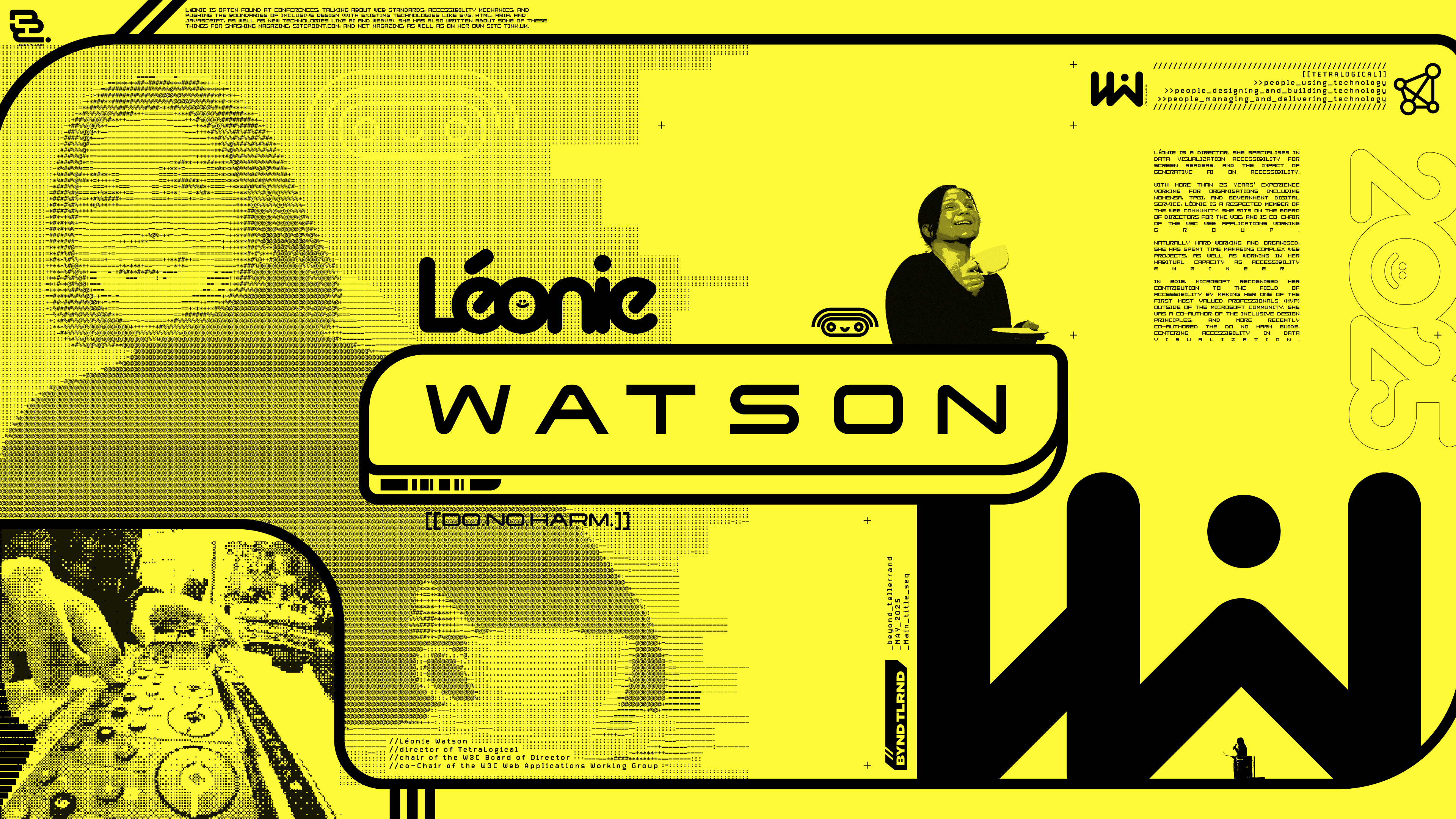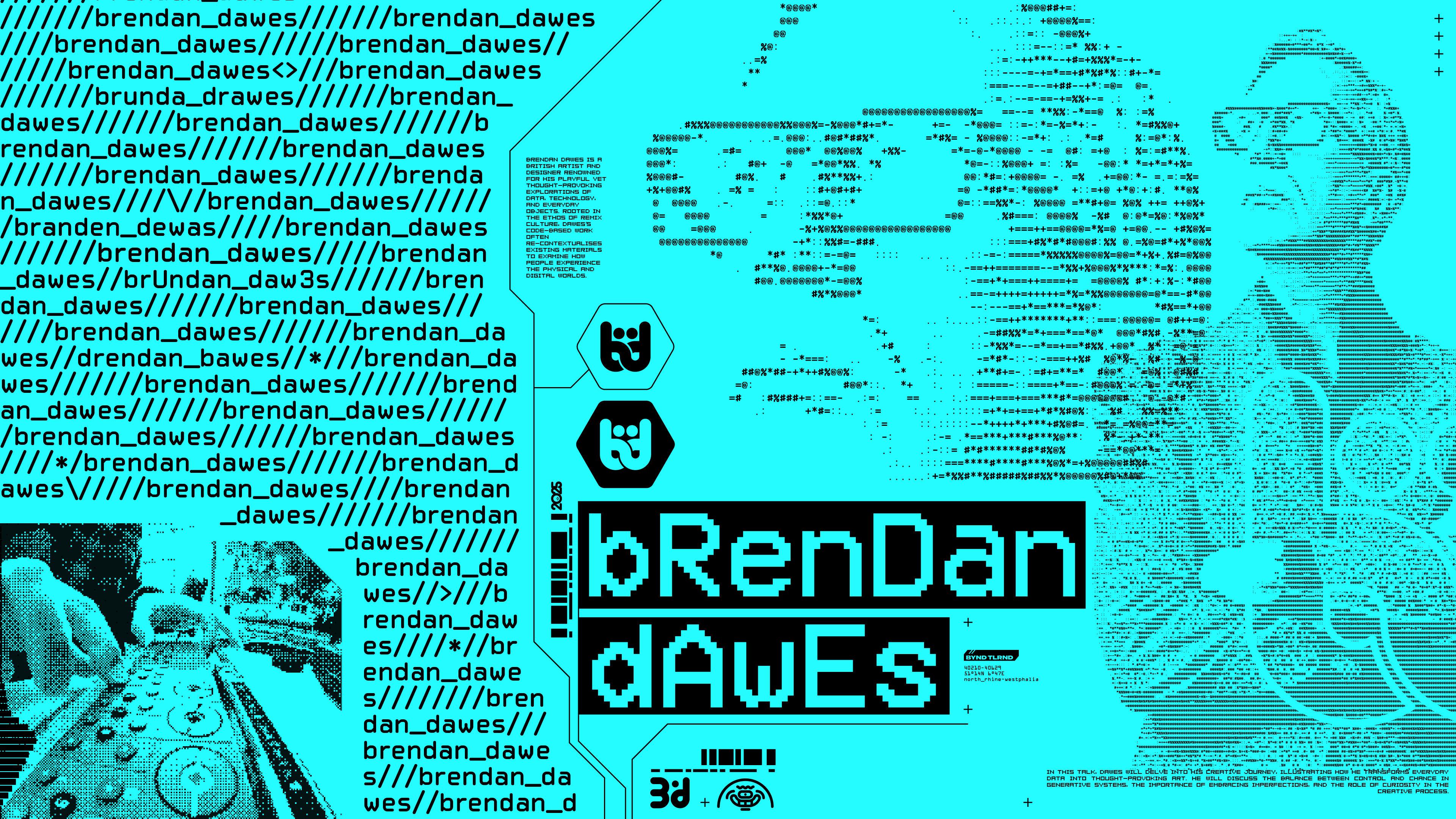 As well as the 2000's era madness, I'm a big fan of the 'cracktro' era of the 90's, of ASCII art and pixel fonts. That aesthetic perfectly compliments the OTT look of the 2000's so I had great fun running different speaker portraits through an Image > ASCII generator.