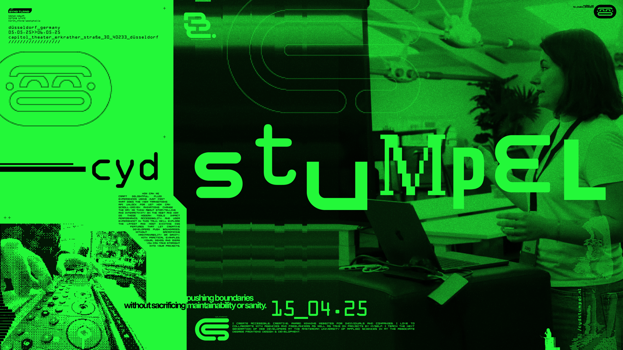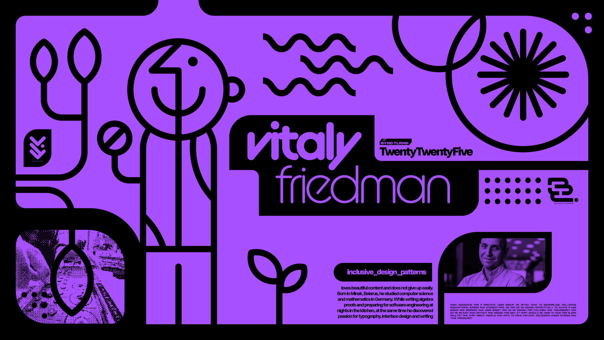 There's a couple of easter eggs in here too, that ASCII figure top right is a photo of Marc taken a few years back, and that little green vector icon on the left-hand side above the icons is a silhouette of Marc on his laptop at an old event. Beyond Tellerrand is Marc, so I wanted it to feel like his.