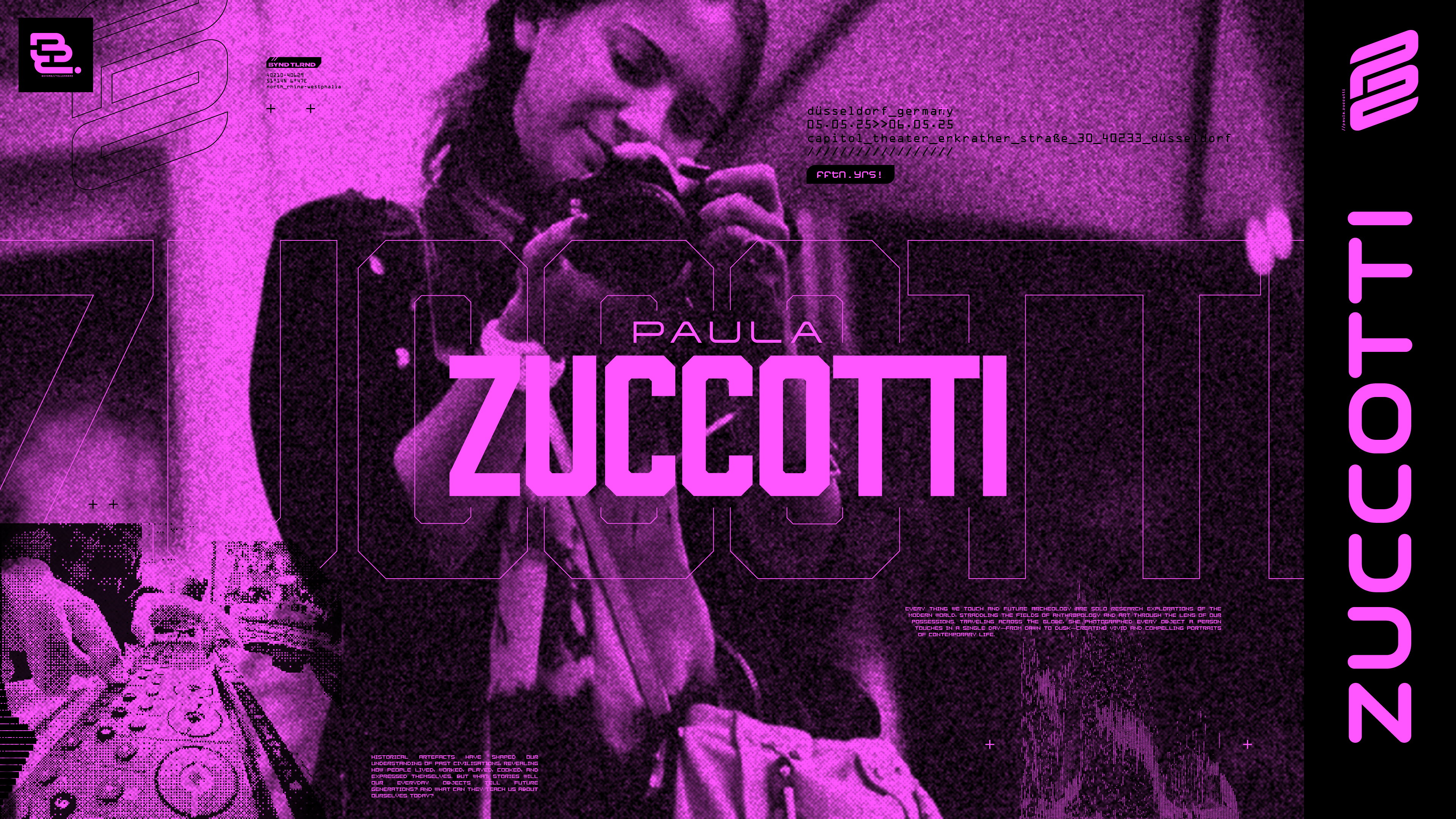 Here we have the whole collection of all twelve speakers. I really enjoyed trying to make everyones design unique, but still a part of the same family. I often reused elements from the main design, like some 'BYND TLRND' graphics and the data/location metadata 'bumf', scaled down real small for that eyeball-OTT look. Vitaly's, for example, is my love letter to the thick vector curve art of Don Pendleton, who was the main designer behind Alien Workshop & Habitat skateboards in the 2000's, and is a huge inspiration to me. Others, like Jason's, are my nod to that time when every single rectangle has a 45° chunk taken out of it. Good times, good times.