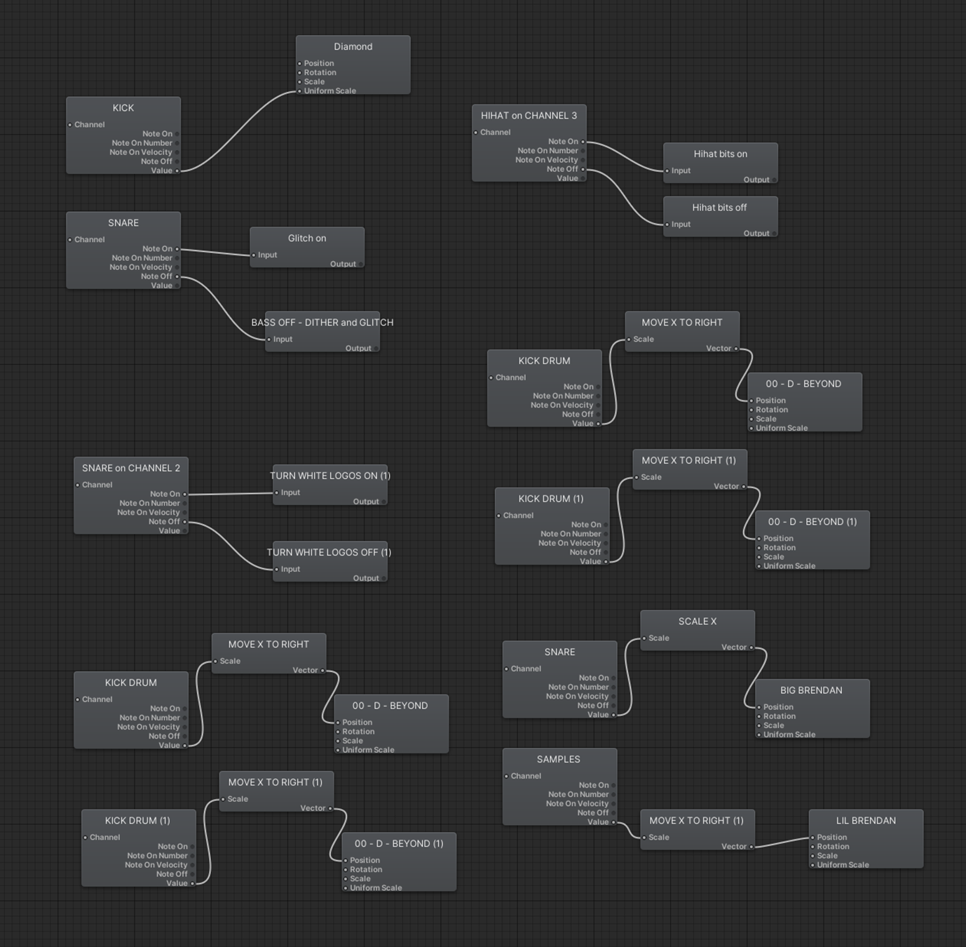 Below is the node tree from Brendan Dawes patches; some stuff scales in size, other stuff jumps in position, other things turn on and off. I know it's not groundbreaking or ultra dynamic, but with this being my first proper foray into realtime reactive things on-stage, I didn't want to get to ahead of myself. Hopefully by choosing strong musical elements like a kick or snare, and connecting it to a movement of a large element on-screen, it still feels dynamic. (This has absolutely given me the buzz though, and learning TouchDesigner is now high up on my to-do list!)